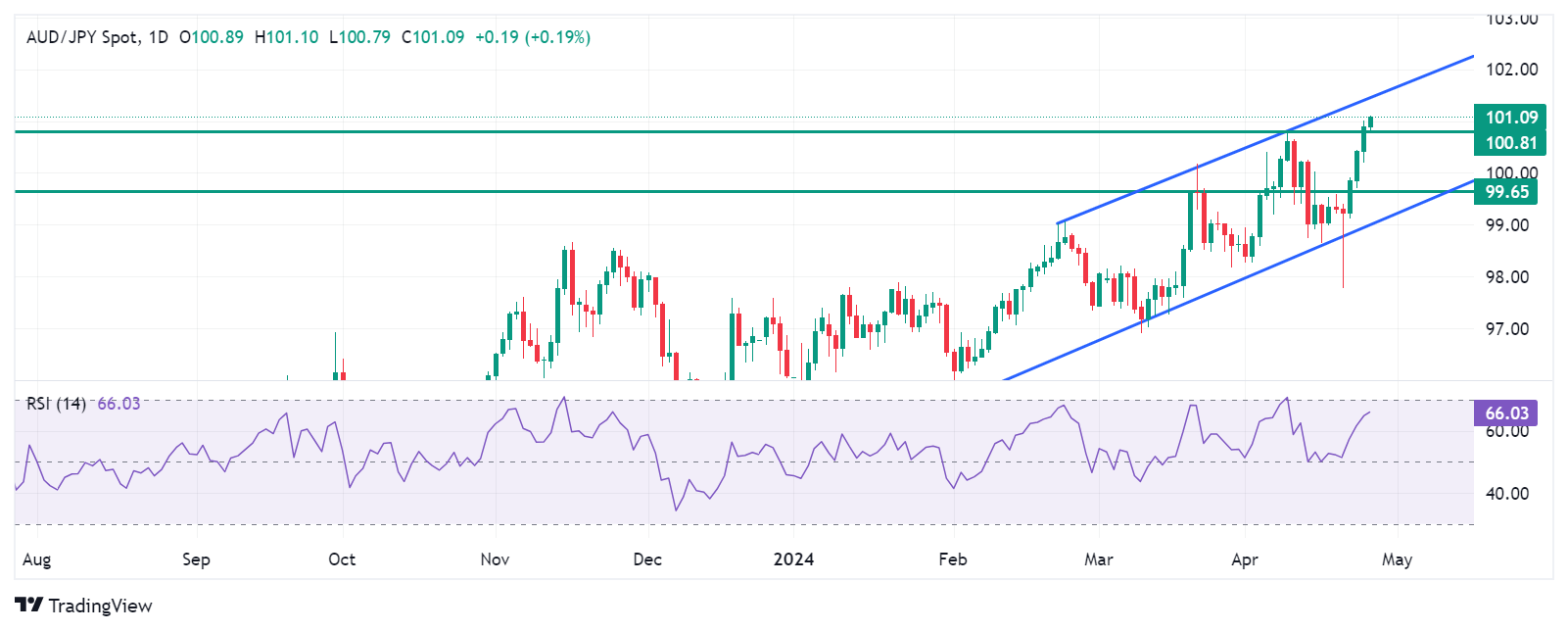 澳元/日元周四交投于101.40附近,在突破4月高点100.81后,逐渐逼向日线上升通道的上限。此外,14 天相对强弱指数 (RSI) 趋势高于 50 水平,支撑了看涨情绪。直接阻力位于主要水平101.50。