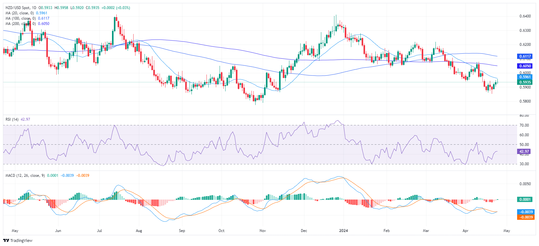 从更广泛的角度来看,纽元/美元一直保持在 20、100 和 200 日简单移动平均线 (SMA) 下方。低于移动平均线的定位揭示了短期和长期框架中普遍存在的看跌趋势。周三买家在 20 日移动平均线 0.5960 处遭到拒绝,强化了卖家在市场上的主导地位,并表明下跌趋势可能会继续。这种情况意味着当前的购买势头还不够强劲,不足以被视为看涨信号。然而,如果买家能够在接下来的交易中克服这一水平,那么表格将会发生变化。