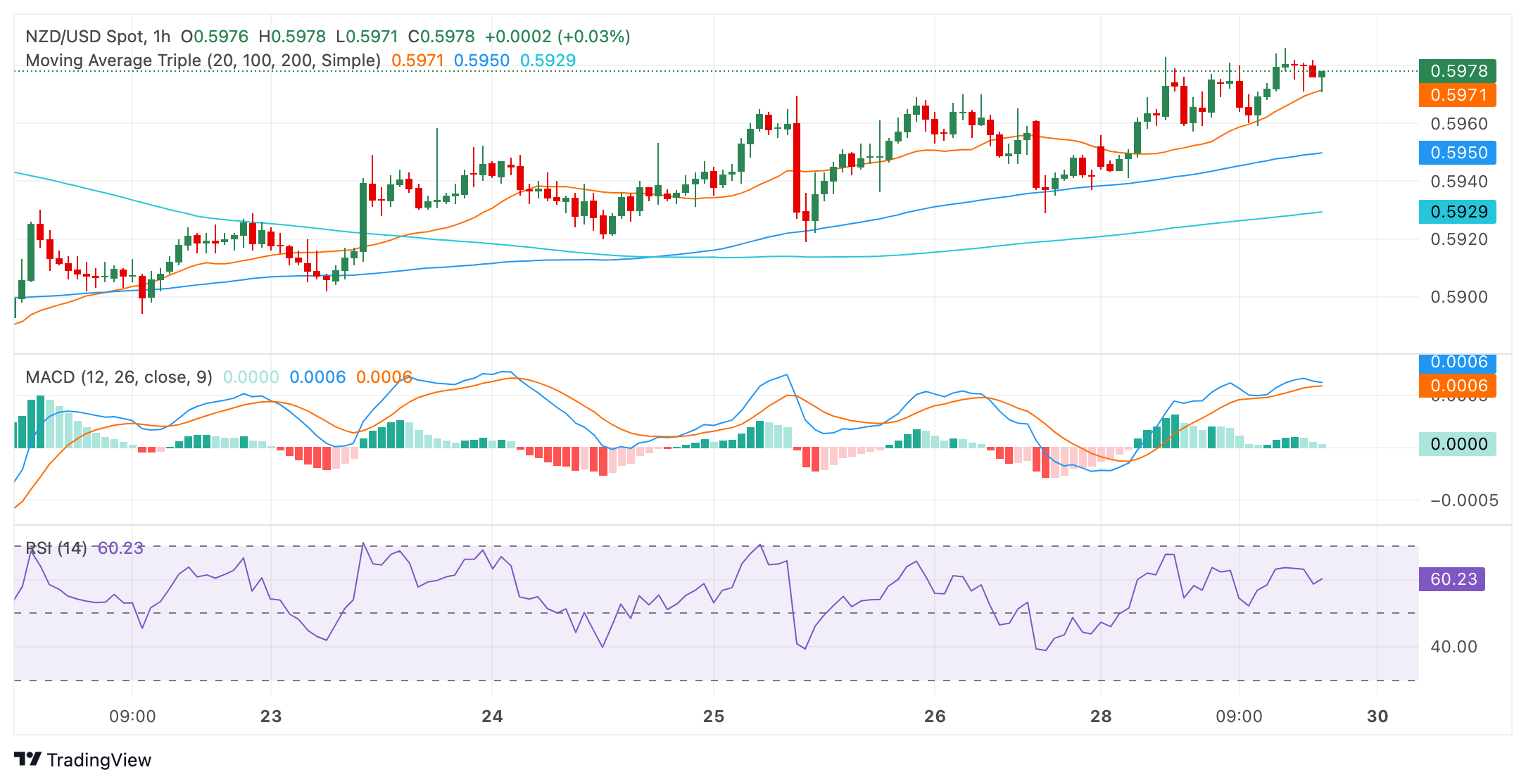 在分析更广泛的范围时,该货币对目前处于看跌态势。新西兰元低于 20、100 和 200 日简单移动平均线 (SMA) 的位置表明整体呈下降趋势。周一 20 日移动平均线拒绝买家于 0.596 关口,这可能会令看涨交易者望而却步。然而,在亚洲时段之前,买家可能会进一步迈出一步以恢复该水平,这可能会提振该货币对的前景。