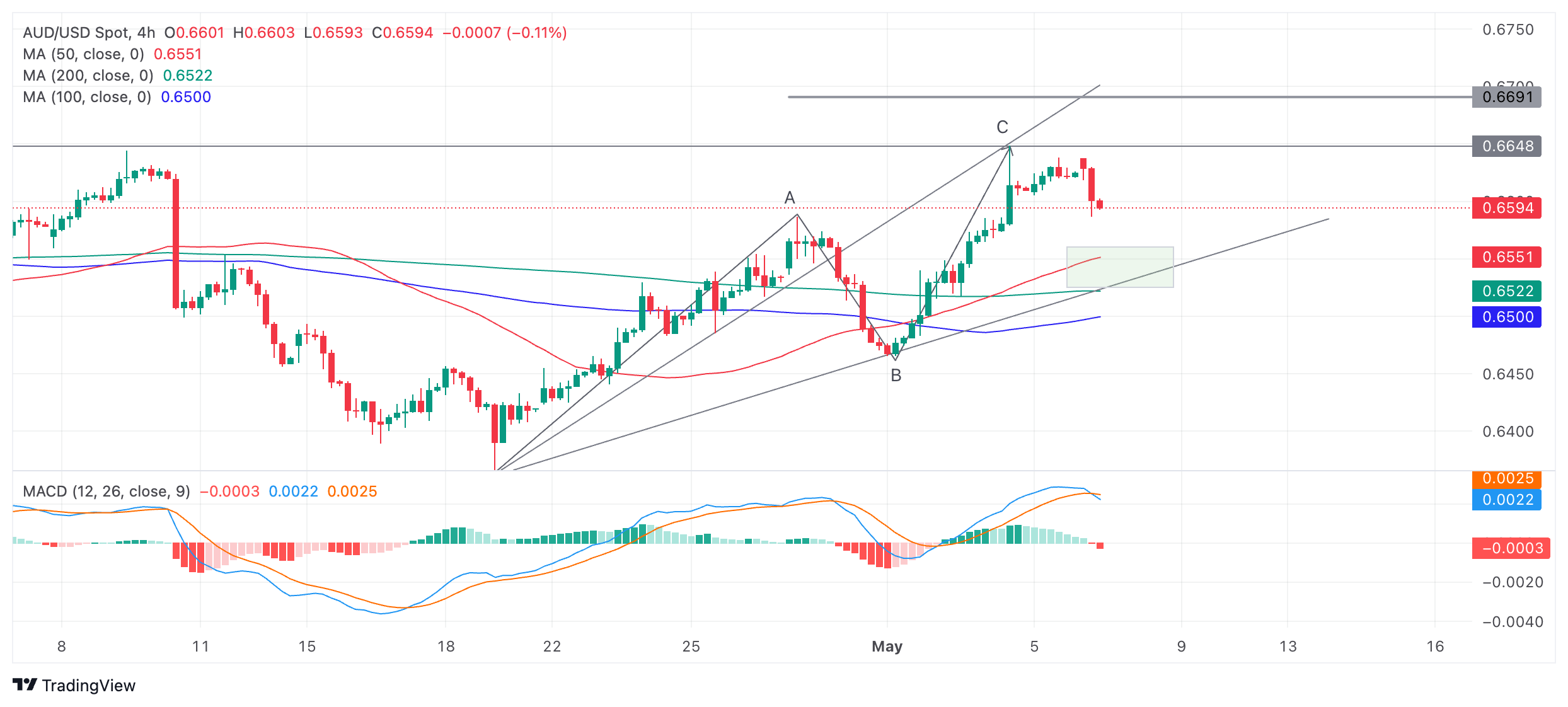 澳元/美元周二交投于 0.6590 区间,继续从 5 月 3 日高点 0.6600 上方回调。