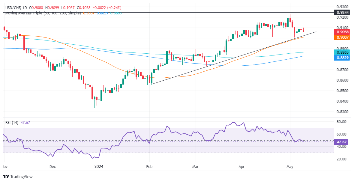 日线图显示,美元/瑞郎呈中性至上行倾向,尽管买家失去动力,如相对强弱指数 (RSI) 转向看跌所示。尽管该货币对在触及年初至今高点 0.9224 后已下跌约 1.80%,但 50 日移动均线汇合处的坚实支撑以及 0.9006/30 附近的支撑趋势线可能会限制该货币对的跌幅。