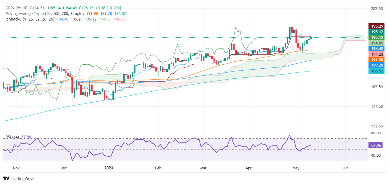 Kijun-Sen (195.26) 处的阻力;突破这一点可能会推向 196.00 和 4 月 26 日高点 197.92。