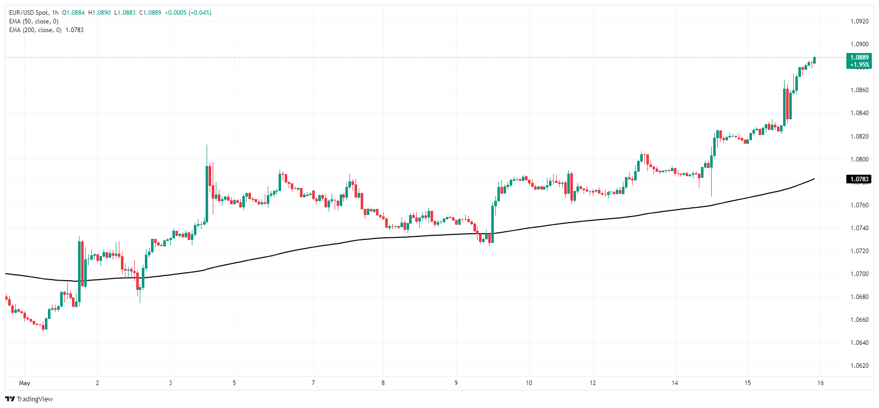 欧元/美元在 1.0900 关口看涨,该货币对延续了从 1.0730 开始的 200 小时指数移动平均线 (EMA) 的看涨反弹。200小时均线正在升至1.0780上方,但盘中买盘已将欧元/美元拖至远高于技术指标的水平,该货币对较4月波动低点1.0600附近上涨超过2.7%。
