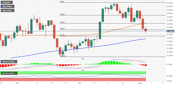 隔夜跌破 24.10 美元至 24.00 美元汇合点(包括 6 月至 7 月反弹的 38.2%斐波那契回撤位和 100 天简单移动平均线 (SMA))被视为看跌交易者的新触发因素。随后跌破斐波那契 50%。该水平增加了负面前景的可信度,并表明 XAG/美元阻力最小的路径是下行。此外,日线图上的技术指标刚刚开始获得负面影响,并支持近期进一步贬值的前景。
