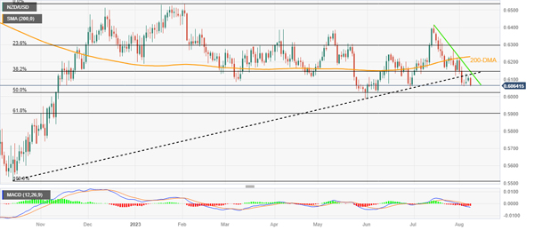 摘要:在 MACD 信号看跌的情况下,新西兰元/美元从 10 个月前的支撑位延续回调。
