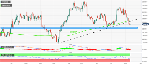 看跌 MACD 信号,明显下行突破先前支撑线,200 日均线有利于 XAG/USD 卖家。