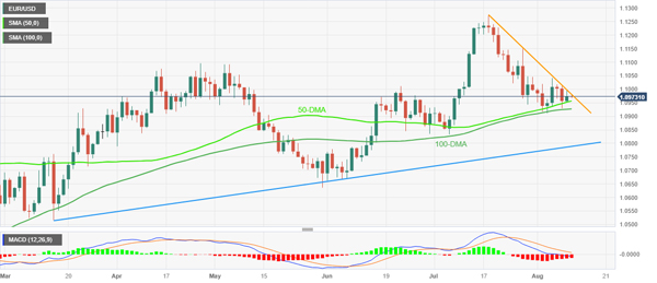 从技术上讲,欧元汇率保持在三周下降阻力线和 50 日均线支撑位之间。然而,MACD 的看跌信号让卖家在关键数据/事件出现之前保持希望。