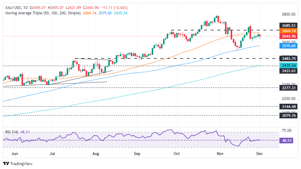 黄金的上涨趋势保持不变,尽管买家无法决定性地清除2669美元的50天简单移动平均线(SMA)。正如相对强弱指数(RSI)徘徊在50中性线附近所示,未来将进一步盘整。