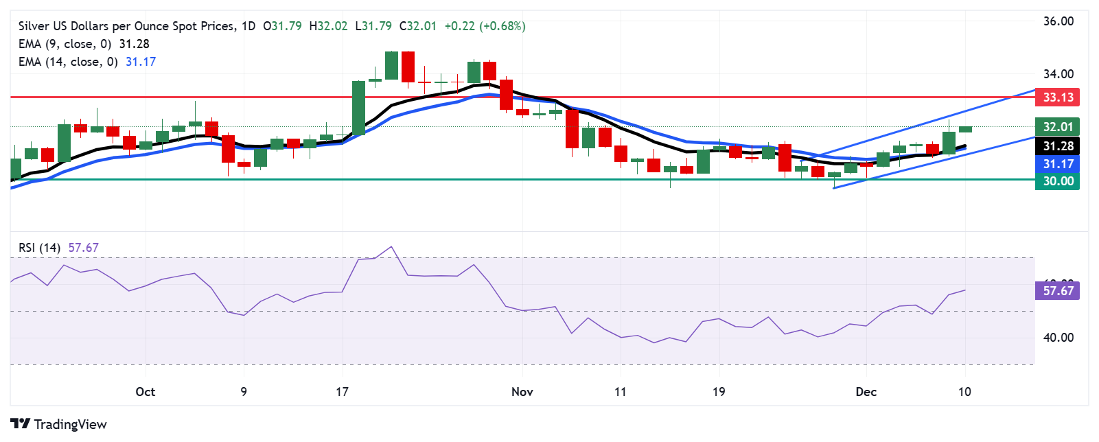 白银价格(XAG/USD)连续第二天上涨,周二亚洲时段交易价格约为每盎司32.00美元。日线图分析表明存在看涨倾向,该货币对在上升通道模式内向上移动。此外,14天相对强弱指数(RSI)仍高于50大关,进一步支撑了看涨情绪。