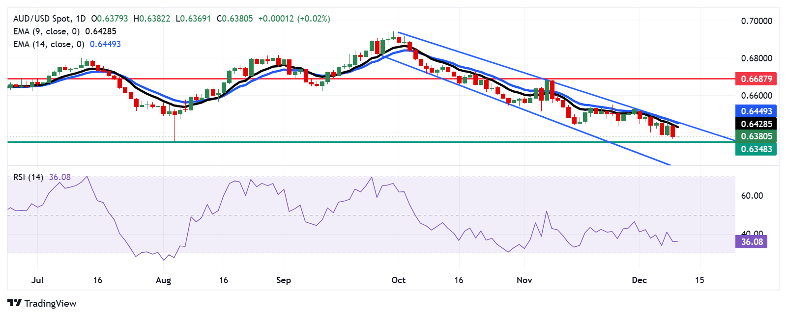 周三,澳元/美元在0.6370附近交易。日线图的技术分析显示,随着该货币对在下行通道模式中向下移动,看跌势头增强。此外,14天相对强弱指数(RSI)略高于30,表明持续的负面情绪。