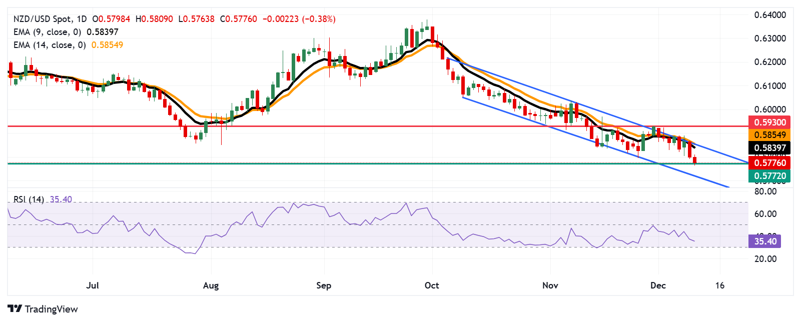 新西兰元/美元对连续第二天上涨,周三欧洲时段交易在0.5780左右。对日线图的技术分析表明,由于该货币对被限制在下行通道模式内,看跌倾向正在加强。