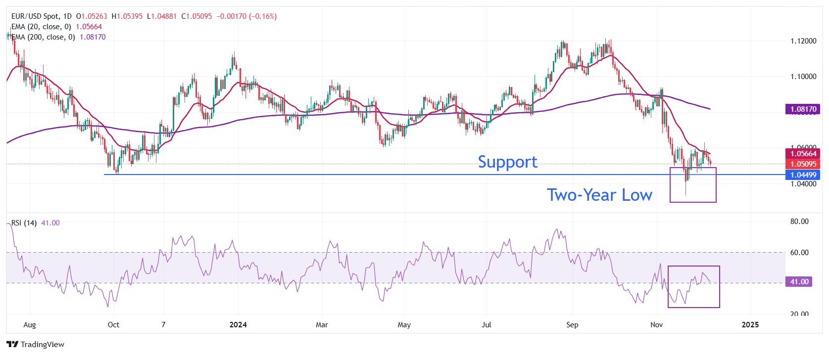 周三欧洲市场,欧元/美元在1.0500的心理支撑附近继续下跌。主要货币对走弱,原因是对欧洲央行(ECB)将在周四的政策会议上将其存款利率下调25个基点至3%的坚定预期,以及美元在11月美国消费者价格指数(CPI)数据公布前走强。