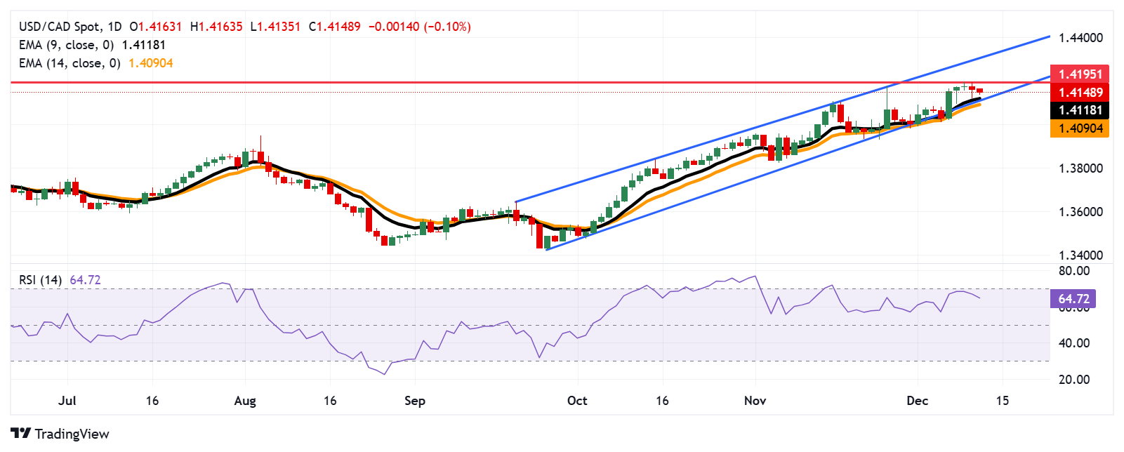 该货币对可能在9天均线1.4118水平找到初始支撑,与上升通道的下限对齐。