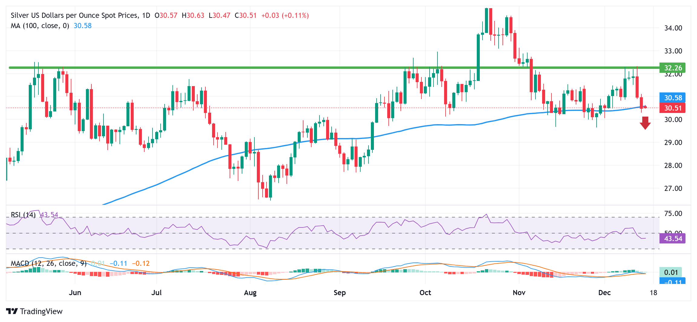 白银价格预测:白银/美元在30.55美元附近盘整,100天SMA
