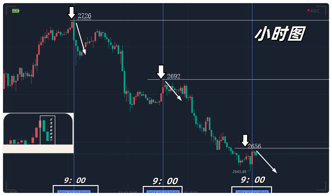 从短线来看,早间有探底回升动作,触及 2643 后反抽,现承压于 2656 上方。观察小时线可知,过往两个交易日均在 9 点前后形成日内短线高点并承压回落,且每轮下跌伴有放量。自 2726 回落、二次冲高不破后再次下行,盘面价格阳线反弹少、幅度小,多为碎阳连续,实体明显连阳罕见。当前盘面虽现单阳形态,但后续阳线大概率只是短线反弹。