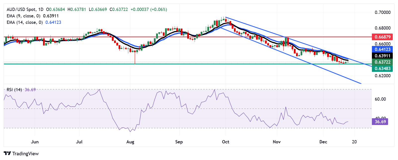 周二,澳元/美元继续保持在0.6370附近的位置。对日线图的分析表明,由于该货币对被限制在下行通道模式内,看跌倾向普遍存在。此外,14天相对强弱指数(RSI)徘徊在30点以上,表明持续看跌势头活跃。