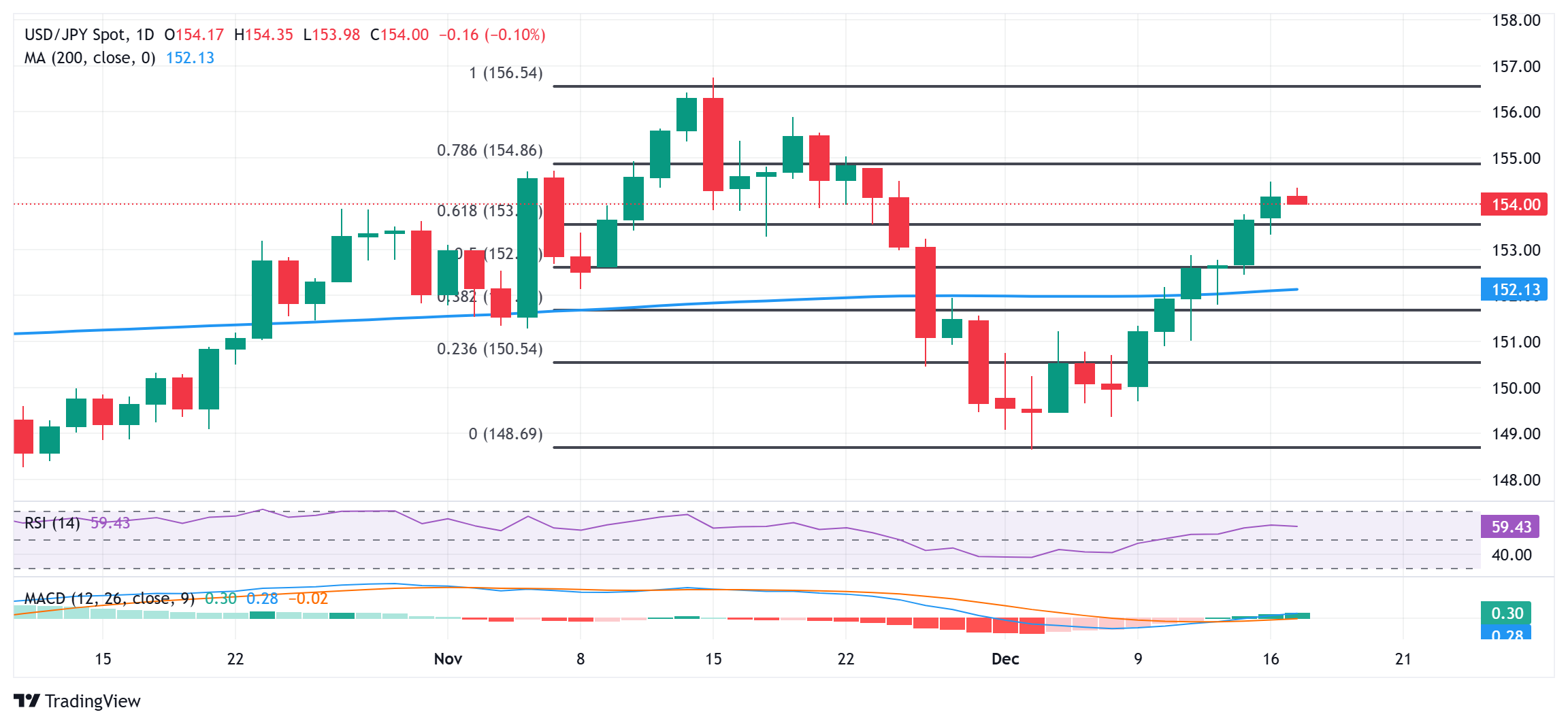 从技术角度来看,周一突破11月至12月61.8%的斐波那契回撤位,从数月高点回落,接受154.00圆的数字可能被视为牛市的关键触发因素。此外,日线图上的振荡指标刚刚开始获得积极的牵引力,并支持美元/日元进一步升值的前景。因此,一些人在隔夜摆动高点154.45-154.50附近继续买入,应为夺回155.00心理关口铺平道路。这一势头可能会进一步延伸到155.00点左右的下一个相关关口,进而达到156.00关口和156.25阻力区。