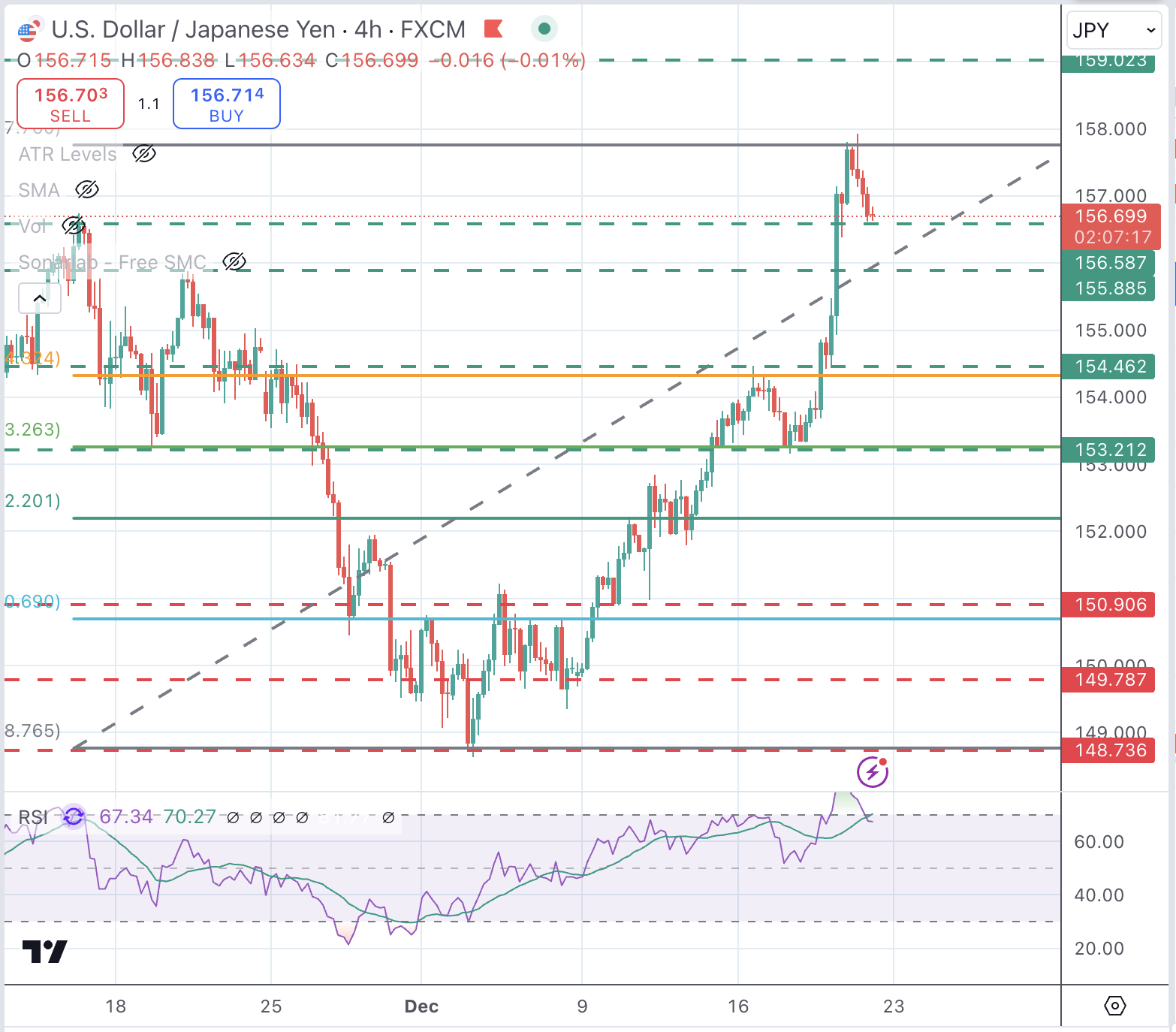 周五,日元从五个月低点回升,受到美元走软和日本通胀数据升温的支撑。美元已从158.00以下的水平回落,并在之前的156.60阻力位测试支撑位。
