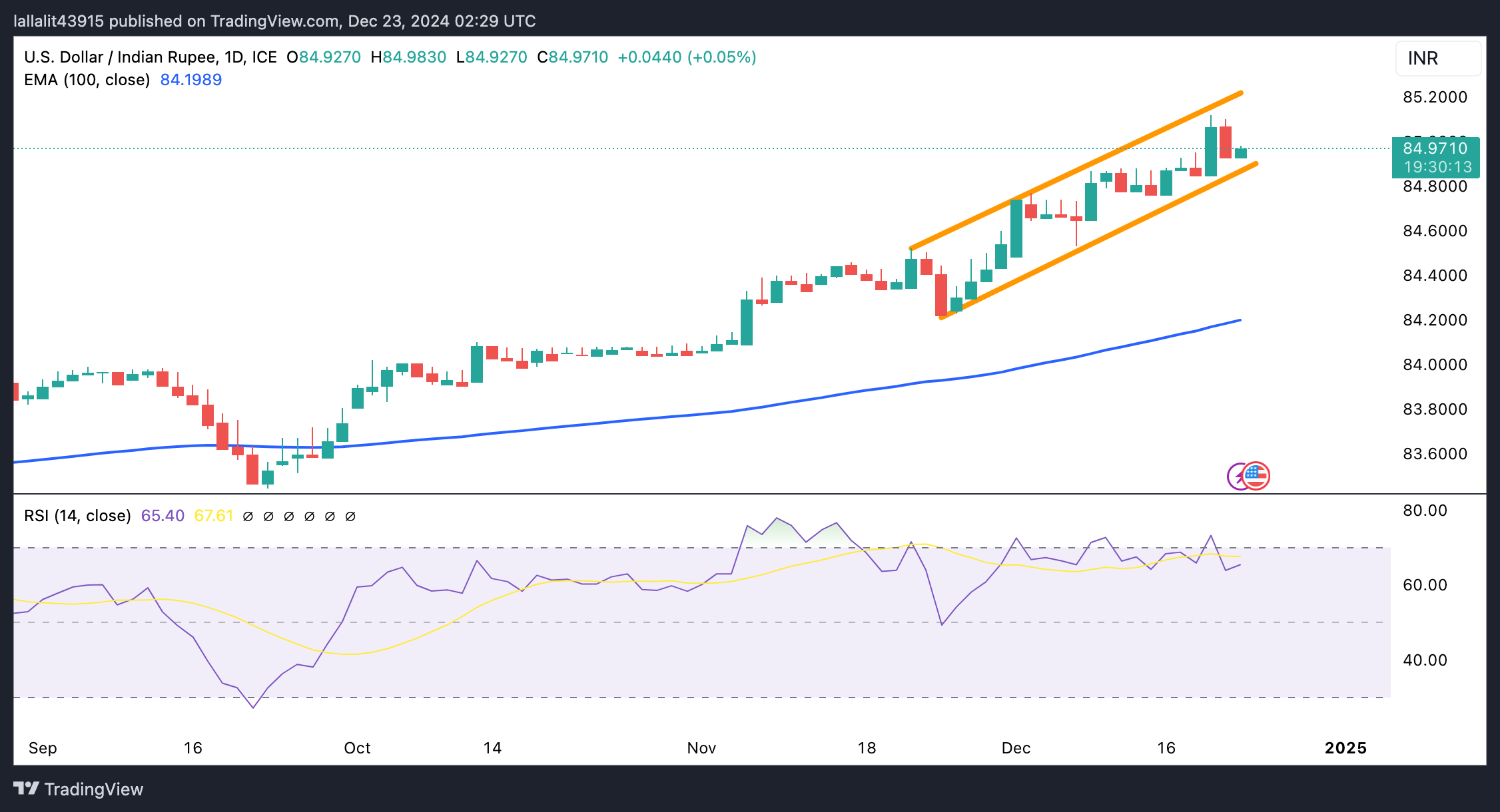 印度卢比当天交易价格较低。美元/印度卢比对的强劲上升趋势保持不变,因为该对在每日时间范围内保持在关键的100天指数移动平均线(EMA)之上。阻力最小的路径是该货币对向上,14天相对强弱指数(RSI)位于65.40附近的中线之上。