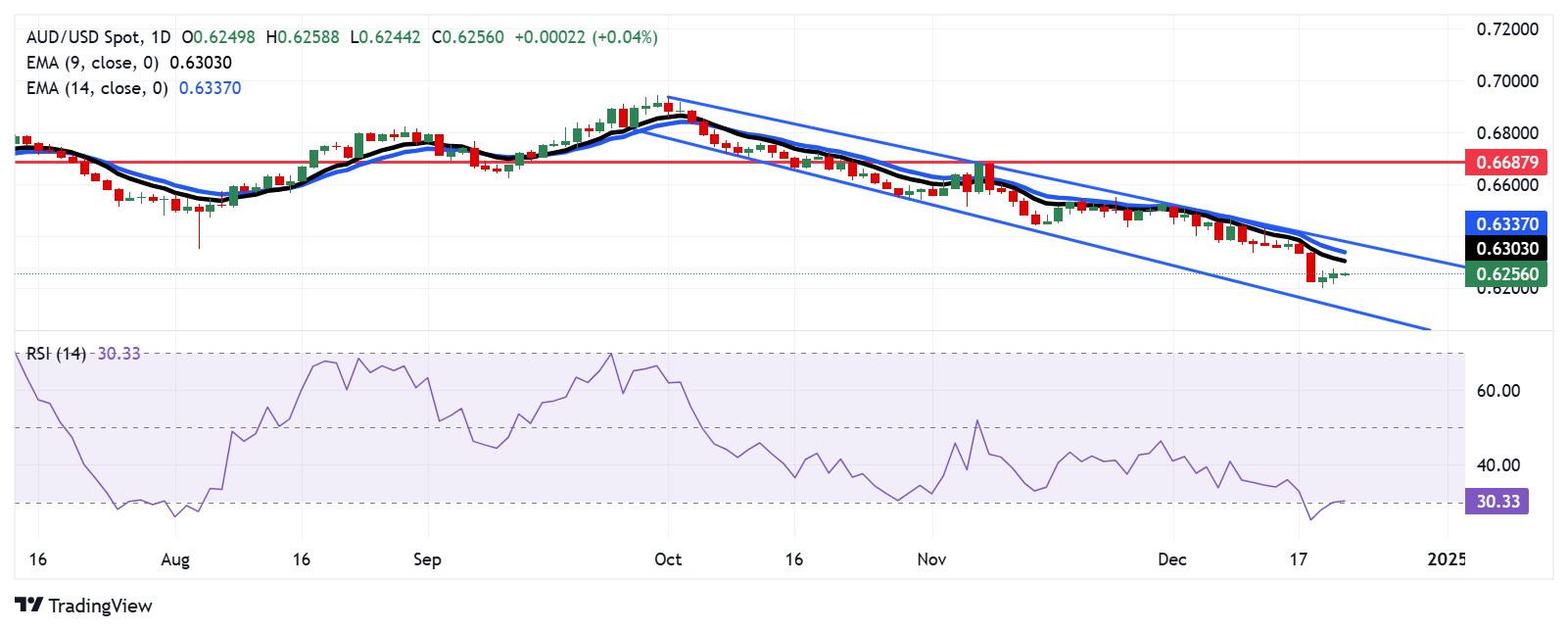 周一,澳元/美元对在0.6250附近交易,日线图分析表明,由于该对仍处于下行通道模式,因此存在持续的看跌倾向。然而,14天相对强弱指数(RSI)徘徊在30点以上,暗示近期可能出现向上修正。