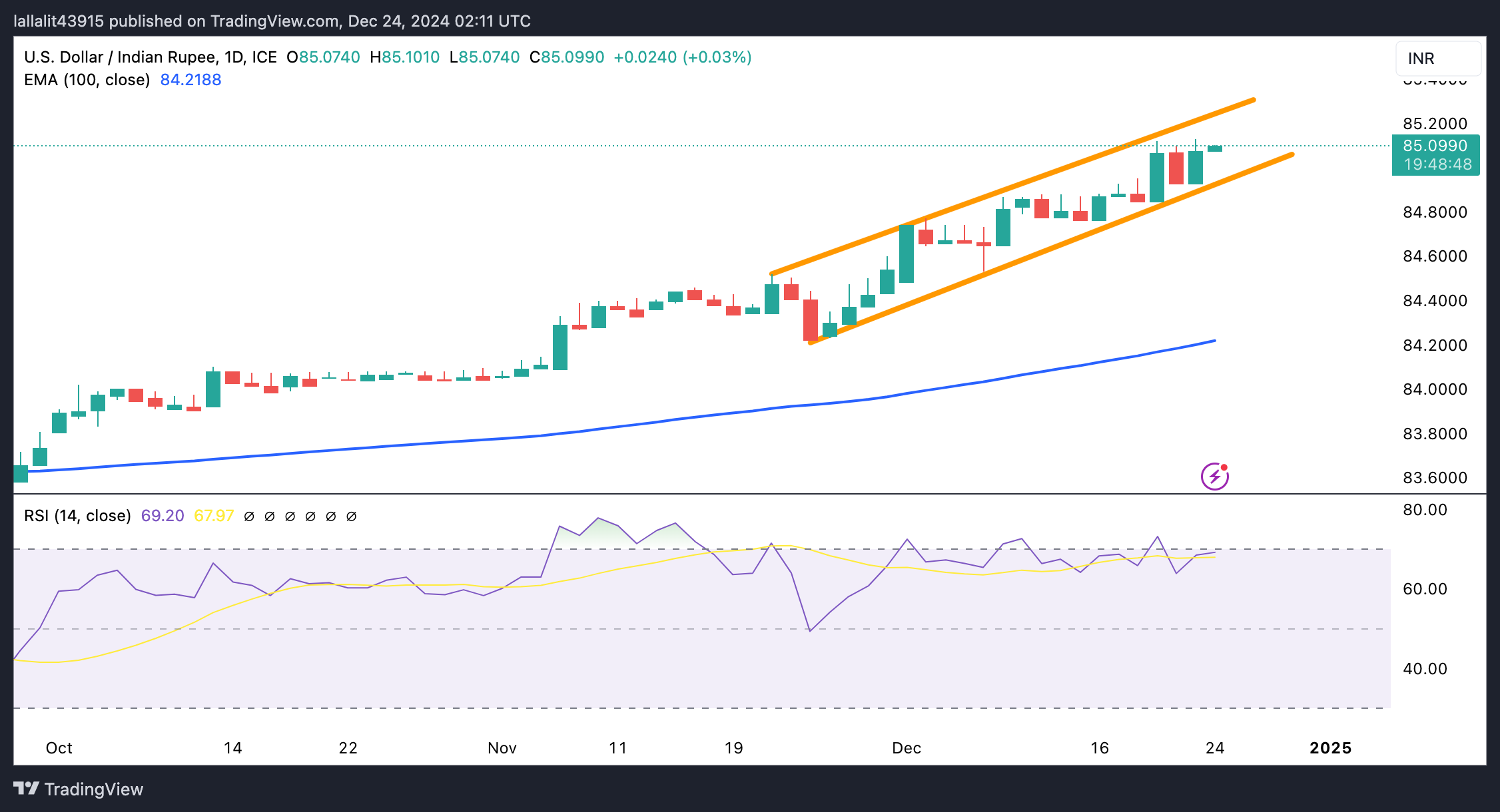 印度卢比当天小幅下跌。然而,美元/印度卢比对的建设性观点仍然存在,其特征是价格在每日时间范围内保持在关键的100天指数移动平均线(EMA)之上。
