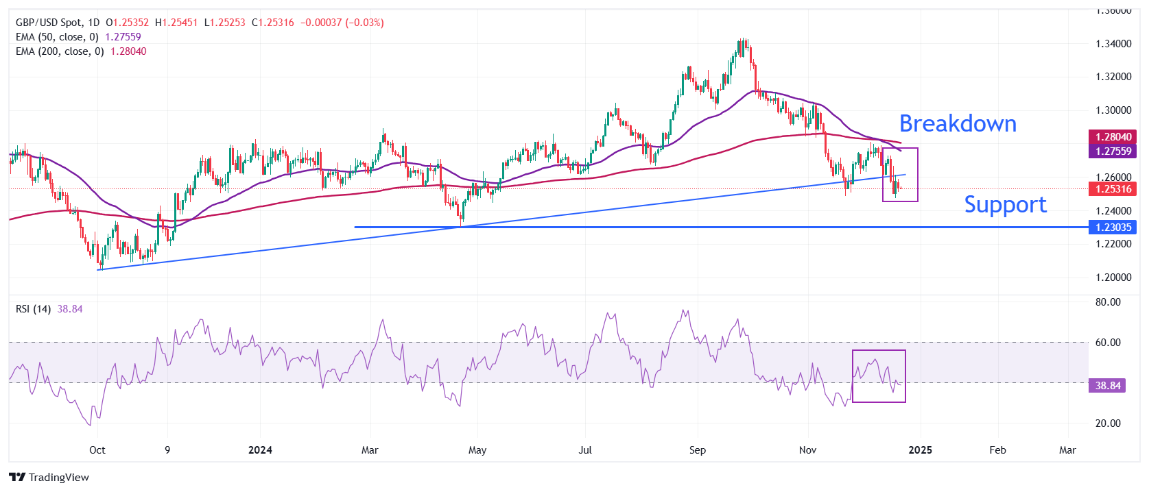 英镑兑美元仍然脆弱,因为它已经决定性地跌破了从2023年10月低点1.2035绘制的1.2600左右的上升趋势线。