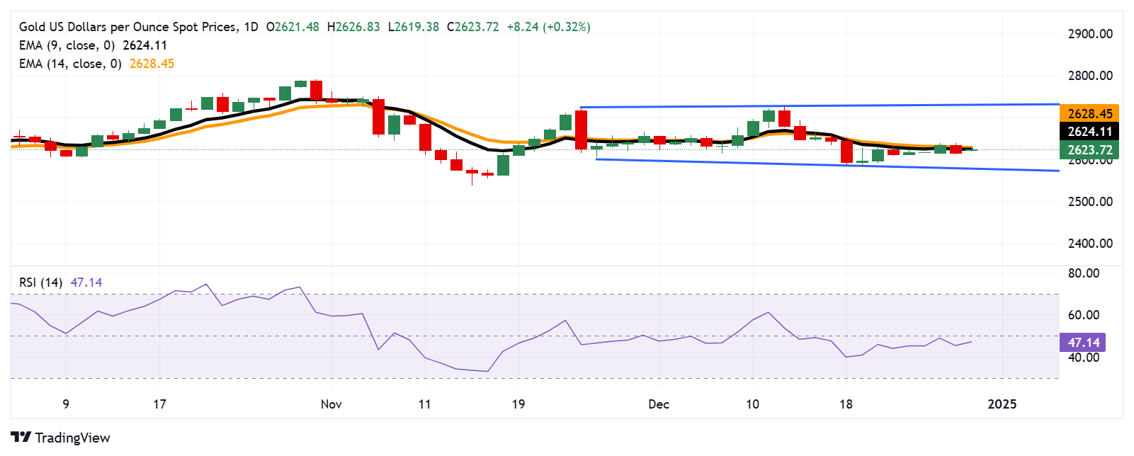 周一,金价在2620.00美元附近交易,日线图显示,随着金属在9天和14天指数移动平均线(EMA)附近横盘整理,金价处于盘整阶段。14天相对强弱指数(RSI)徘徊在50点以下,反映出中性情绪。高于50的决定性走势可能表明对大宗商品的购买兴趣增加。