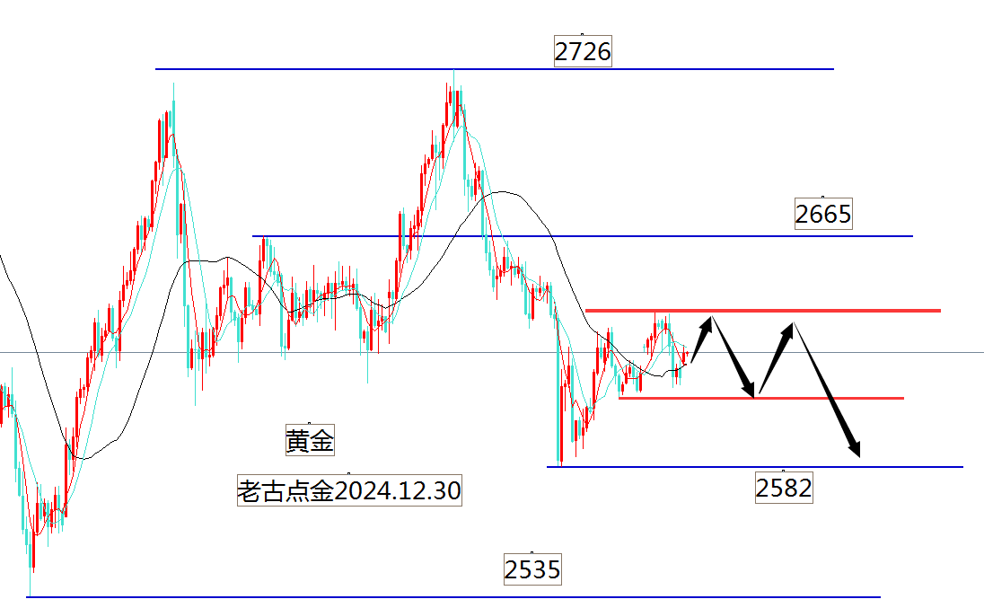 上周的黄金基本是一个节假日周,圣诞节让市场变得比较安静,周线最终收小星星,全周波动都不大,本周将延续节假日周,本周有元旦节,周二到周五都有国家休息,老古预估本周波动也不会大,本周我们需要关注的是年线的收线,目前看年线收超级大阳线已经没有悬念了,2024年因地缘因素和美联储的政策让黄金跨入历史新高。今天短线思路我们先关注它反弹的高点,日内我们预估的波动区间是2611-2638,如果先反弹我们先考虑空的机会,震荡行情需要区间拦截,找好节奏才是最重要的。下面分析图是近几周震荡的结构图。