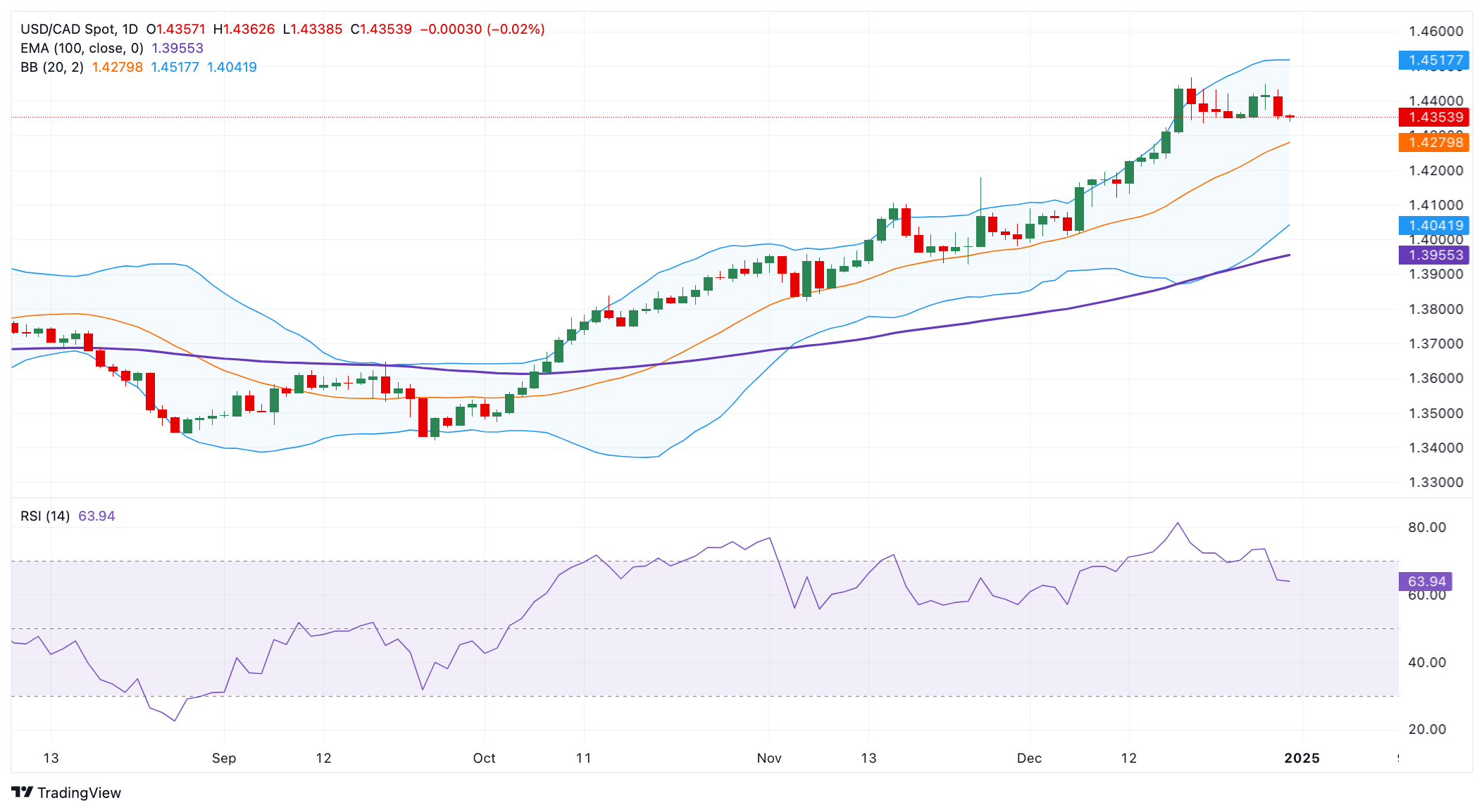另一方面,该货币对的初始支撑位位于1.4210-1.4200区域,代表12月13日的低点和心理水平。持续下跌可能为1.4042铺平道路,这是布林带的下限。另一个需要关注的下行过滤器是1.3955,即100天均线。