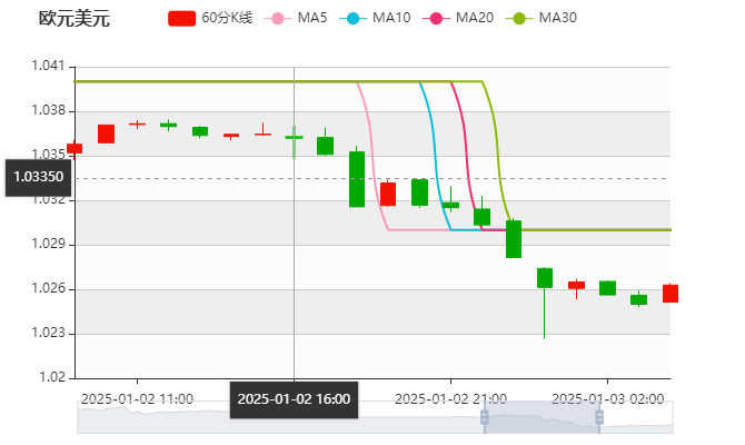 周五(1月3日)亚盘早盘,欧元兑美元上涨,目前交投于1.02附近,截止北京时间11:00分,欧元兑美元报价1.0272,涨幅0.10%,上一交易日欧元兑美元收盘为1.0262。欧元兑美元周四又下跌了整整一个百分点,以两年来的最低价格拉开了2025年的序幕。自2022年11月以来,欧元兑美元汇率跌破1.0250,如果1月份情况没有改善,Fiber将连续第四个月出现亏损。