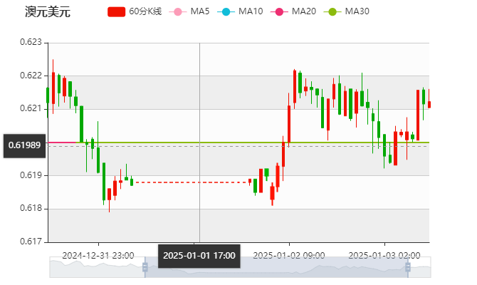 周五(1月3日)亚市早盘,澳元/美元上涨,目前交投于0.62附近,截止北京时间10:40分,澳元/美元报价0.6215,上涨0.18%,上一交易日澳元/美元收盘报0.6192。由于澳大利亚经济持续放缓,澳元/美元货币对下跌。