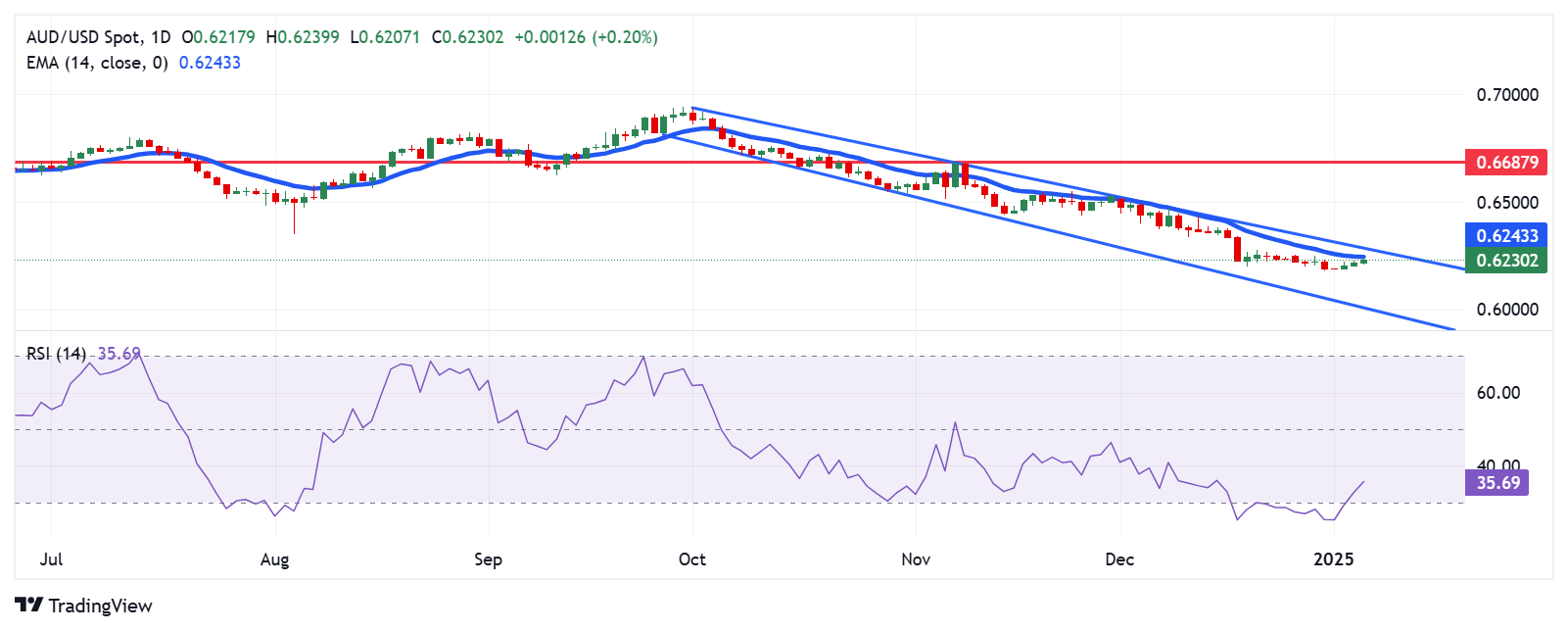 周一,澳元/美元对在0.6230附近交易,保持看跌前景,因为它继续在日线图上的下行通道内移动。然而,14天相对强弱指数(RSI)攀升至30点以上,表明尽管持续下跌,但看跌势头可能减弱。