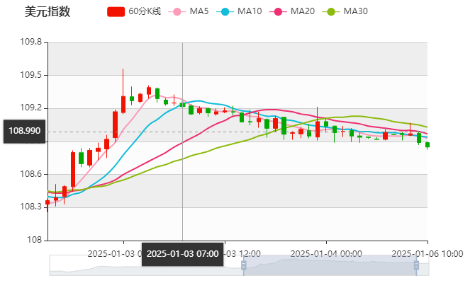 周一(1月6日)亚盘早盘,美元指数最新价报108.88,跌幅0.03%,开盘价为108.93。对美联储2025年降息幅度较小的猜测以及对美国经济的乐观情绪可能会普遍提振美元。