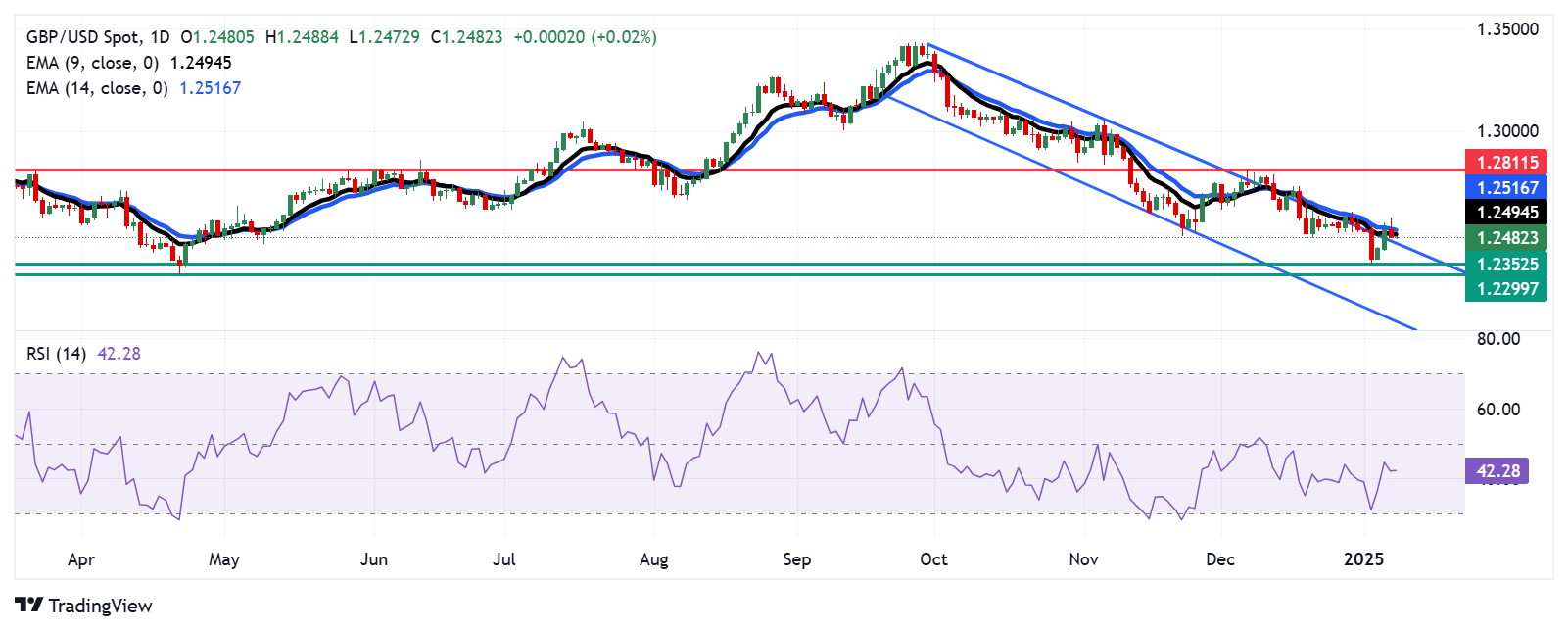 英镑/美元在前一交易日下跌后保持其头寸,在周三的亚洲时间徘徊在1.2480左右。日线图的技术分析表明,看跌趋势正在减弱,因为该货币对的交易价格高于下跌通道模式的上限。