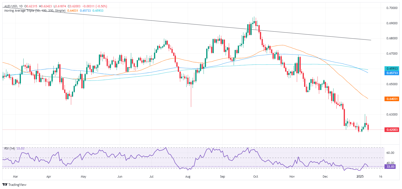 自2024年10月以来,澳元/美元连续创下一系列较低的高点和低点,下跌趋势保持不变。尽管该货币对在0.6178附近触底,但随着该货币对徘徊在0.6200附近,预计将进一步下跌。突破后者将暴露2022年10月的低点0.6169,随后是2020年4月的月度低点0.5991。