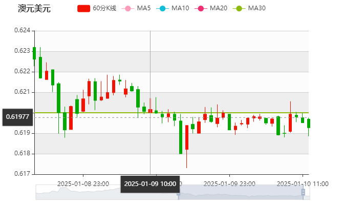 周五(1月10日)亚市早盘,澳元/美元下跌,目前交投于0.61附近,截止北京时间10:57分,澳元/美元报价0.6197,下跌0.01%,上一交易日澳元/美元收盘报0.6196。由于澳大利亚11月份零售销售数据增长弱于预期,澳元(AUD)周四表现逊于主要货币。