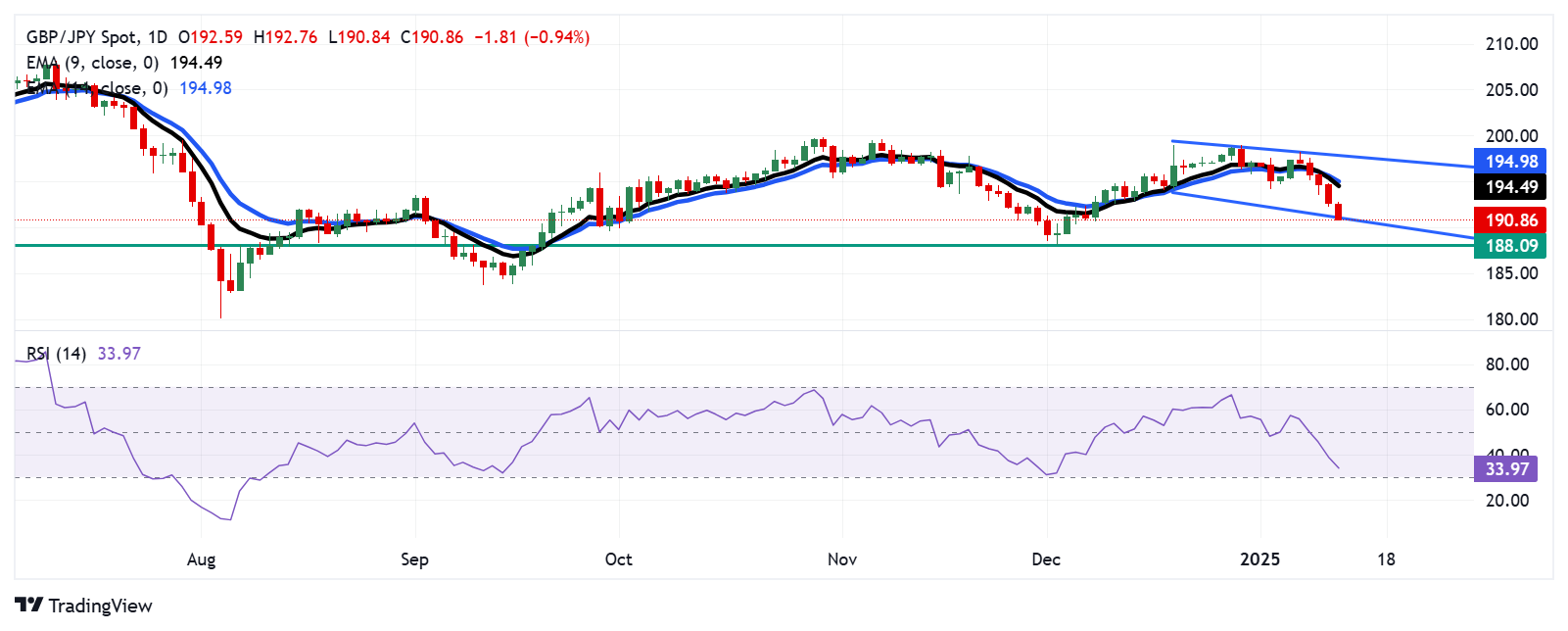 英镑/日元价格分析:跌至191.00以下,接近上升通道的下限