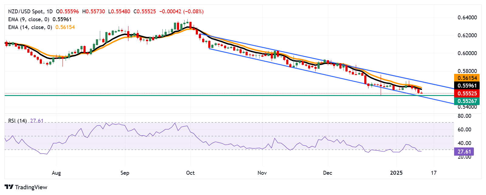 新西兰元/美元继续其自1月7日开始的下跌趋势,周一欧洲时间交易在0.5550左右。日线图的技术分析表明,由于该货币对在下降通道的下限附近交易,因此存在持续的看跌倾向。
