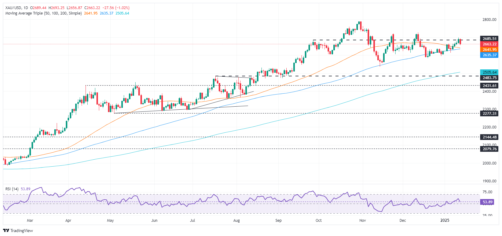 随着美国国债收益率升至2023年11月以来的最高水平,寻求安全的交易员购买了美元,金价在北美时段回落。在撰写本文时,XAU/USD在未能清算2700美元后交易于2657美元,下跌1.20%。