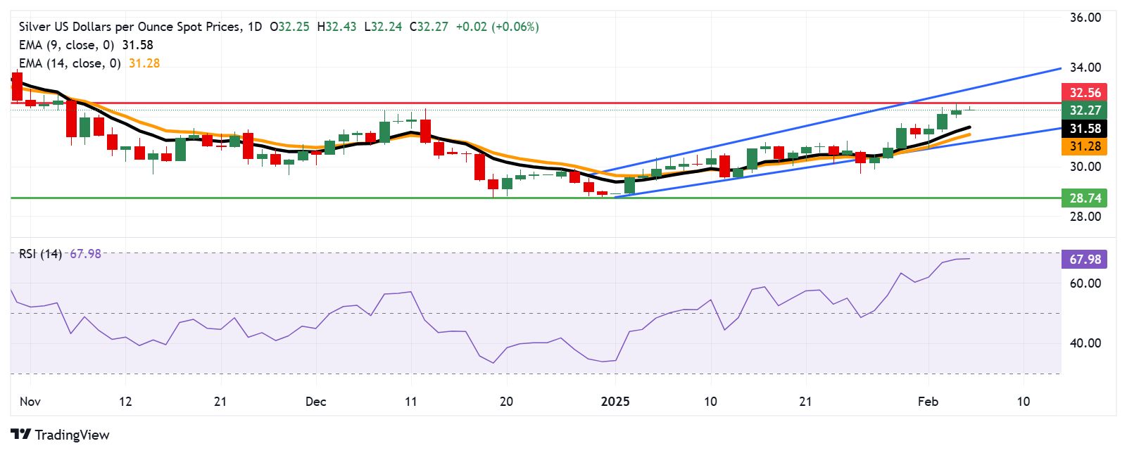 白银价格(白银/美元)连续第四个交易日延续涨势,周四亚洲时段交易价格接近每盎司32.30美元。日线图的技术分析突显出强烈的看涨倾向,价格在上升通道内保持上升轨迹。