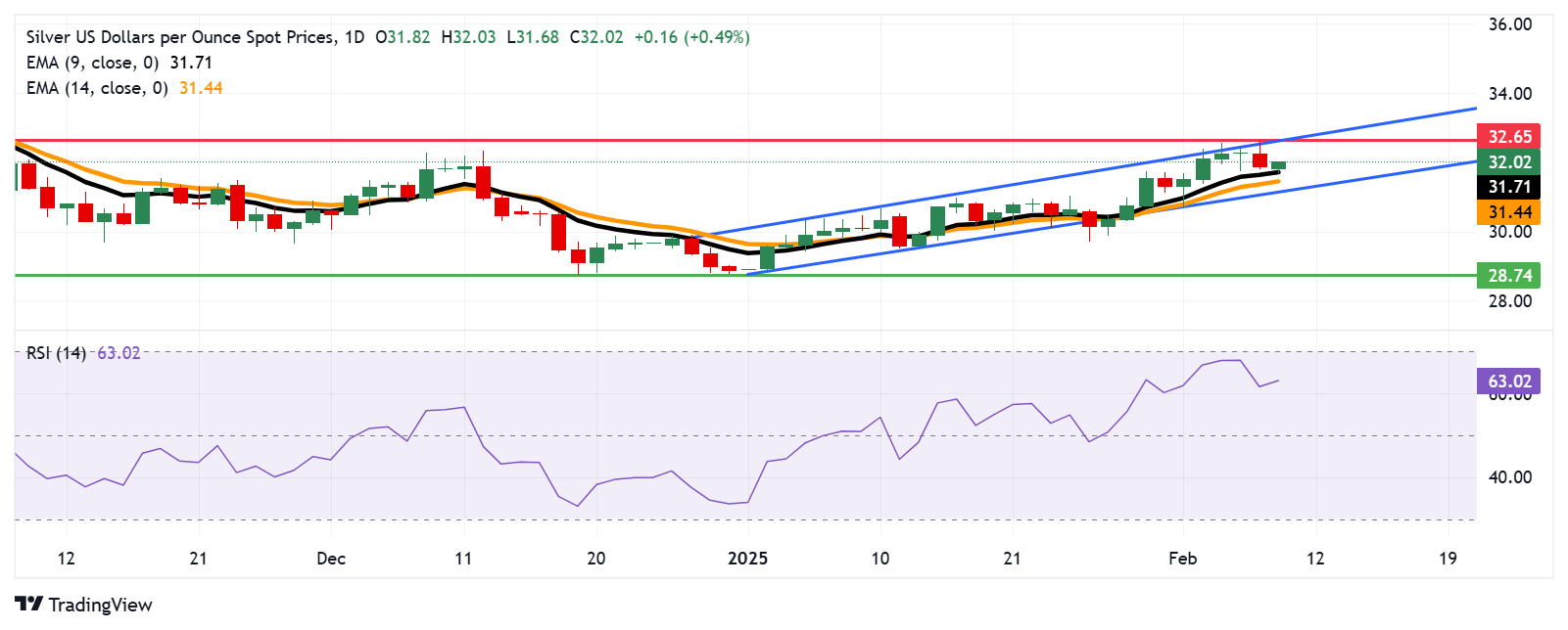白银价格(XAG/USD)从最近的下跌中反弹,在周一的亚洲交易时段徘徊在每盎司32.00美元附近。日线图分析表明,金属价格呈持续看涨趋势,在上升通道内上涨。