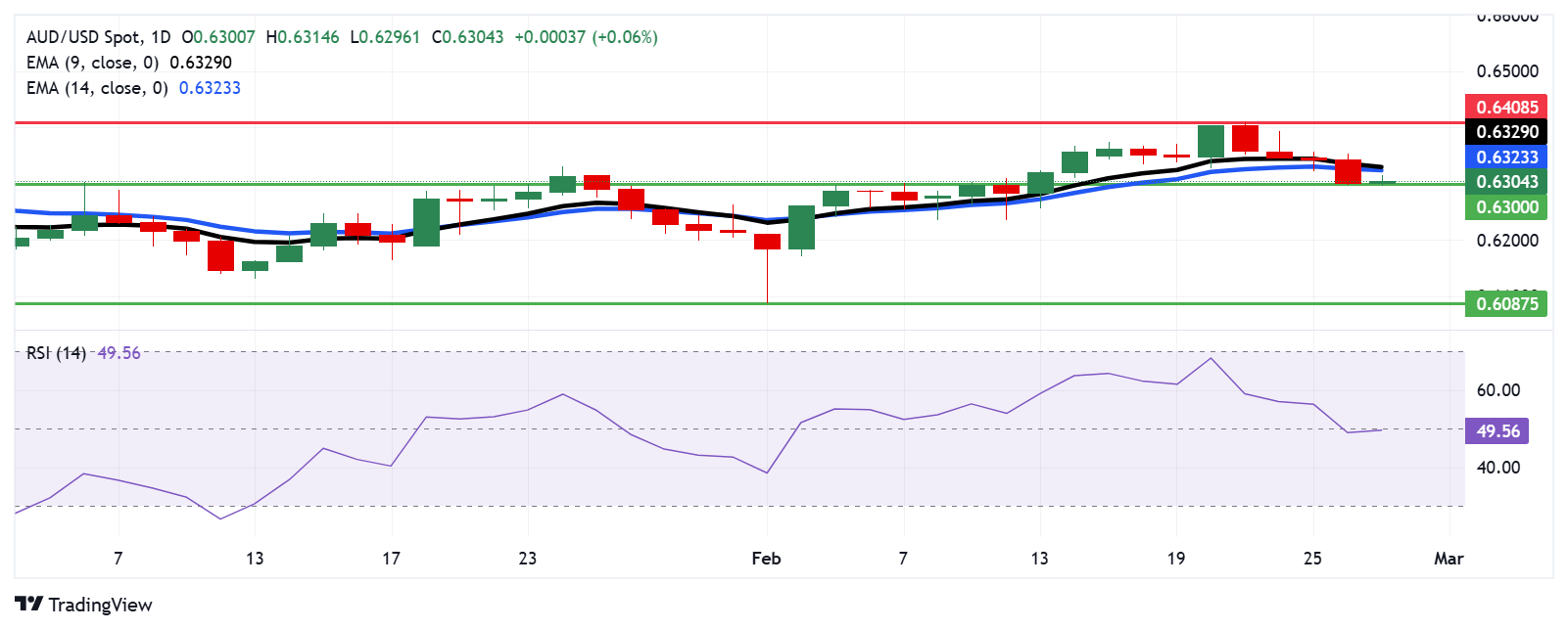 周四,澳元/美元汇率徘徊在0.6300左右。日线图分析表明,该货币对保持在9天和14天指数移动平均线(EMA)以下,表明短期价格势头减弱。此外,14天相对强弱指数(RSI)仍低于50,强化了普遍的看跌前景。