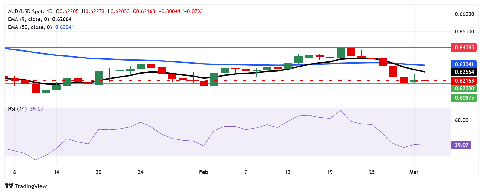 周二,澳元/美元在0.6210附近交易,由于徘徊在九天指数移动平均线(EMA)以下,仍面临压力。这一定位表明短期势头减弱。此外,14天相对强弱指数(RSI)仍低于50,强化了看跌前景。
