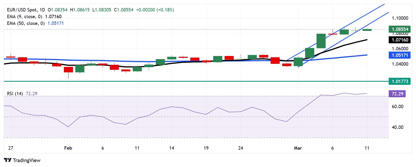 欧元/美元价格分析:升至1.0850以上,同时仍处于超买区域