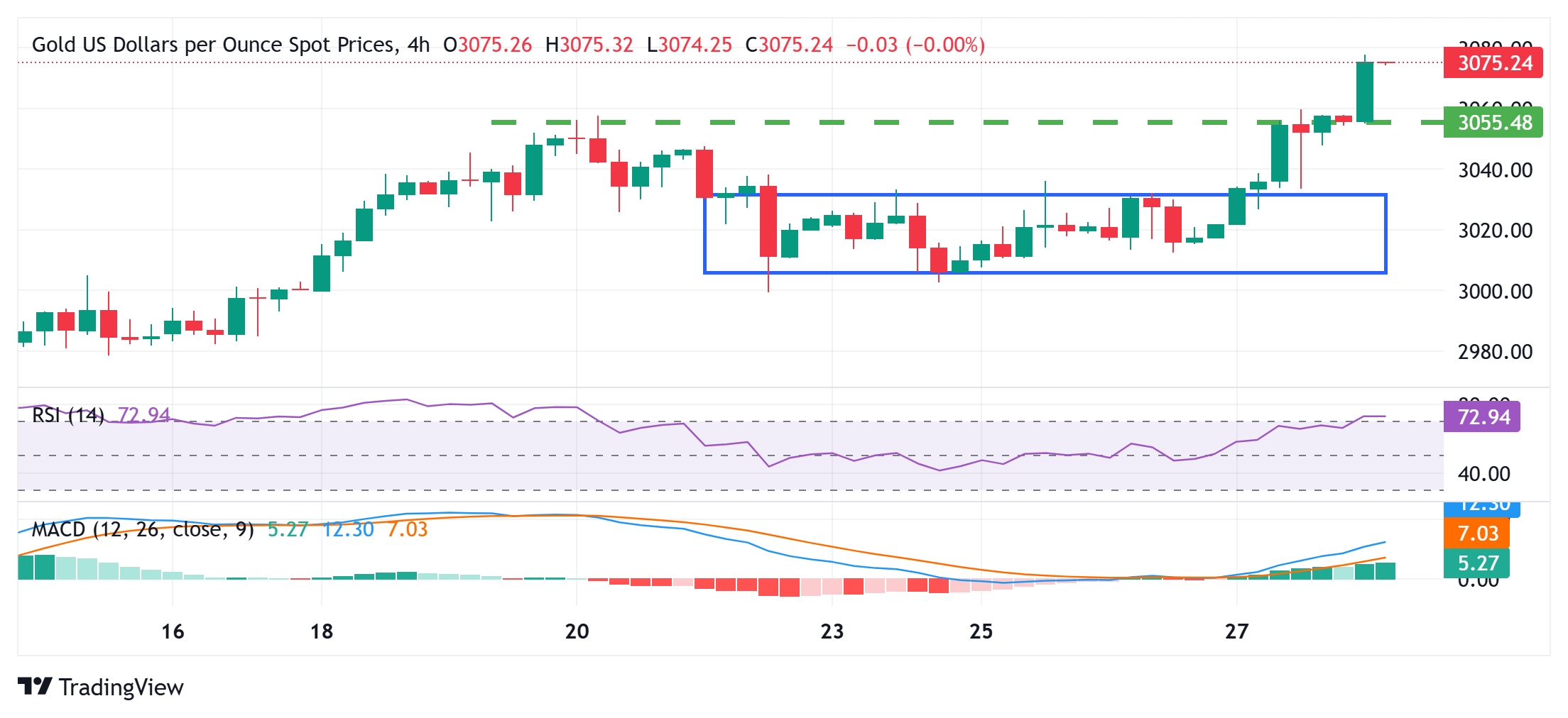 周五,黄金价格(XAU/USD)连续第二个交易日走高,在亚洲时段触及新的历史新高,约为3,077-3,078美元。美国总统唐纳德·特朗普所谓的互惠关税及其对全球经济的影响持续存在的不确定性,令投资者情绪承压。这一点可以从股票市场普遍偏弱的氛围中看出,而这一氛围又推动安全避险资金流向贵金属。