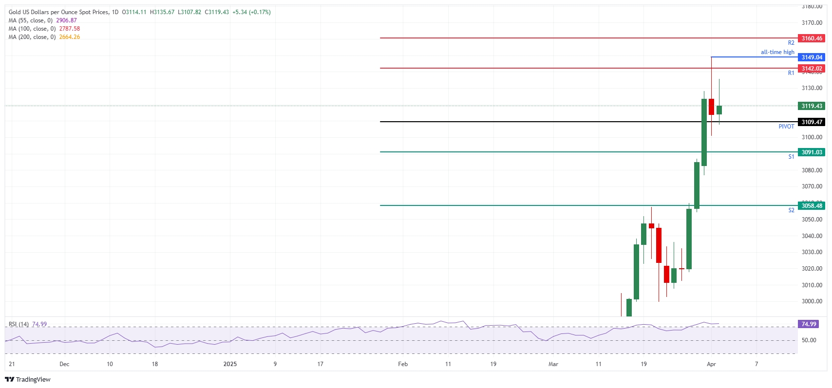 黄金价格 (XAU/USD) 在周三写作时稳定在3120美元以上,但仍创下新的历史纪录,达到3149美元。 黄金 热潮在 美国 总统唐纳德·特朗普在白宫正式宣布后停滞不前,他将在本周三宣布互惠关税,其整个内阁出席。然而,随着不确定性增加,这一宣布本身可能比最初预期的影响力更小,导致本周黄金出现大幅修正,这是“买传闻,卖新闻”事件。