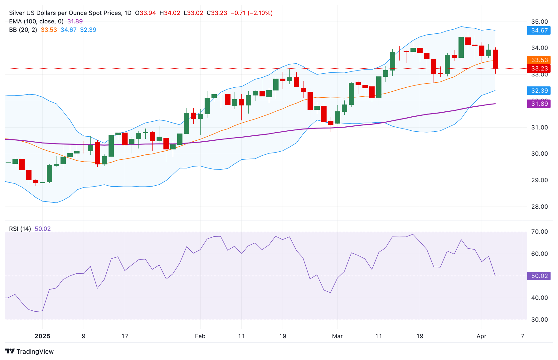 在周四的欧洲早盘,由于一些获利回吐,银价(XAG/USD)下跌至接近33.15美元。然而,由于美国总统唐纳德·特朗普在周三宣布了广泛的全球关税,引发了对贸易战争扩大的担忧,白金属的下跌可能有限。