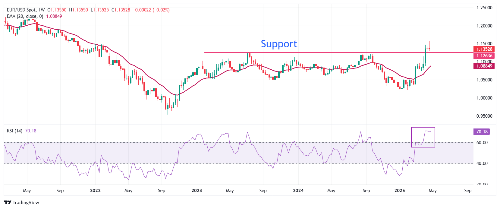 周五,欧元兑美元下跌至接近1.1350。然而,主要货币对的前景依然看涨,因为20周指数移动平均线(EMA)在1.0885附近呈上升趋势。