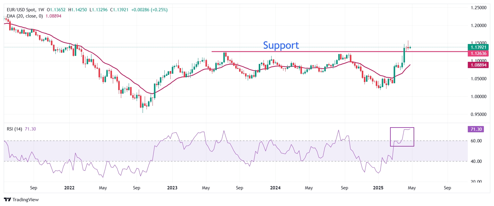 在周二的欧洲交易时段,欧元/美元在1.1400附近下跌。前景显示,主要货币对仍然看涨,因为20周指数移动平均线(EMA)在1.0890附近呈上升趋势。