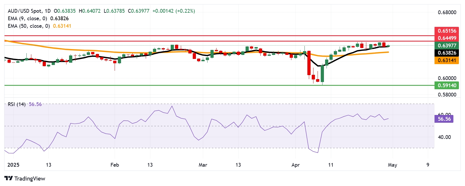 AUD/USD 对盘周三徘徊在 0.6390 左右,日图显示看涨前景。该对继续在九日指数移动平均线(EMA)上方交易,而 14 日相对强弱指数(RSI)远高于 50 水平——这都表明有持续的上涨动力。